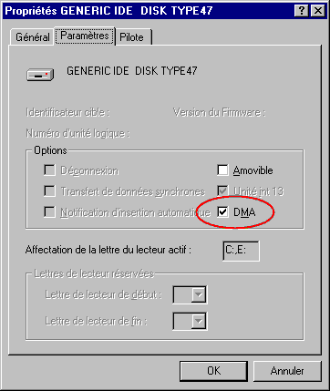Attention : j'ai eu un gros problème en activant le DMA sur un lecteur DVD Creative Encore 12X. Après son activation mon lecteur est devenu barge. Il lisait le contenu des CD ou DVD, arrivait a lire les images mais plantait systématiquement à l'installation des programmes. Erreur dans fichier INF ou EXE. Bref, pas bon du tout. |
